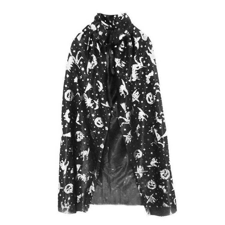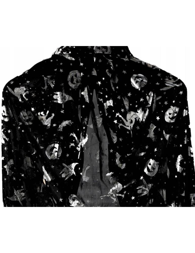 Czarna peleryna z kołnierzem, ozdobiona srebrnymi motywami czarownic, dyni i nietoperzy, to idealny dodatek do stroju na Halloween lub bal przebierańców. Wykonana z lekkiego, połyskującego materiału, zapewnia swobodę ruchu i wygodę noszenia. Srebrne wzory dodają tajemniczości i blasku.Peleryna wiązana pod szyją. To stylowy i praktyczny element stroju, który z pewnością przyciągnie uwagę na każdym przyjęciu.