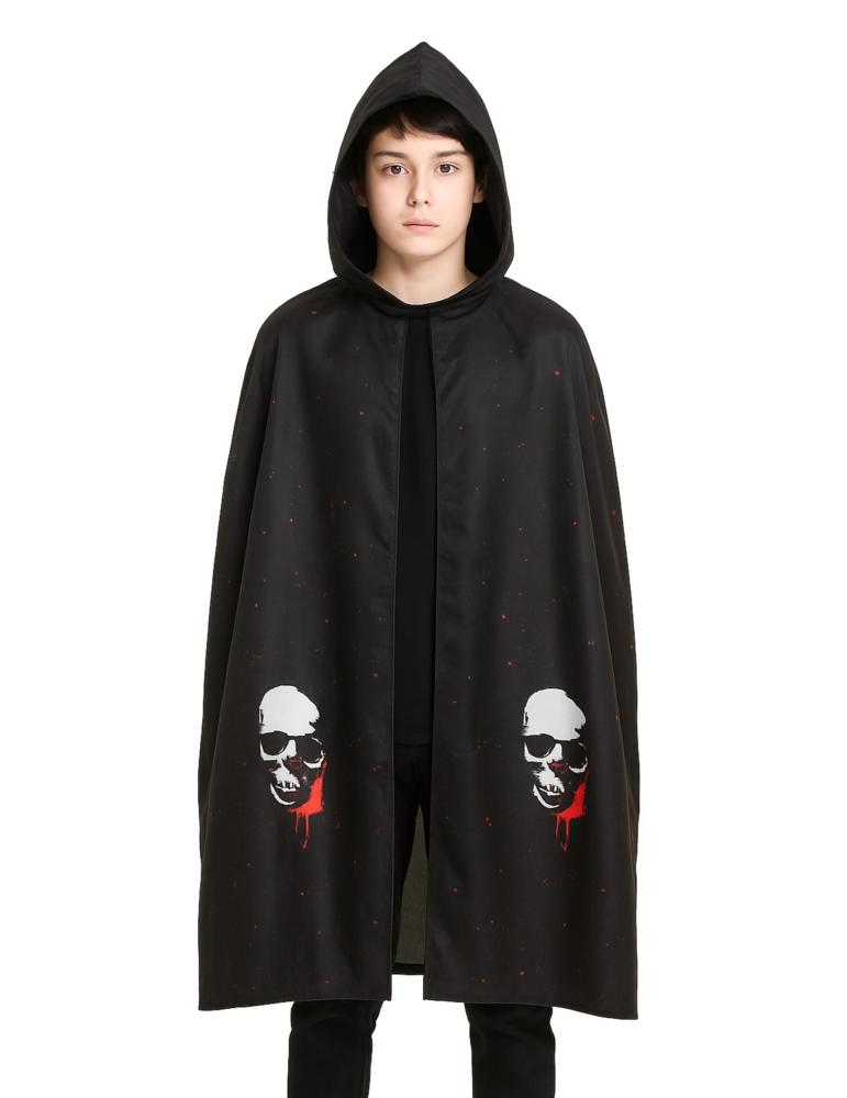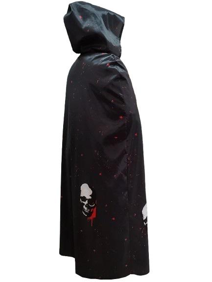 Peleryna z kapturem w kolorze czarnym z motywem czaszek i krwi, wiązana pod szyją tasiemką.