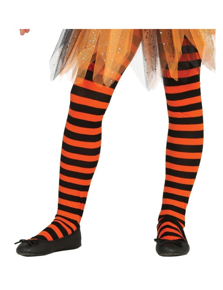 Rajstopy czarno-pomarańczowe w paski, w rozmiarze dziecięcym.