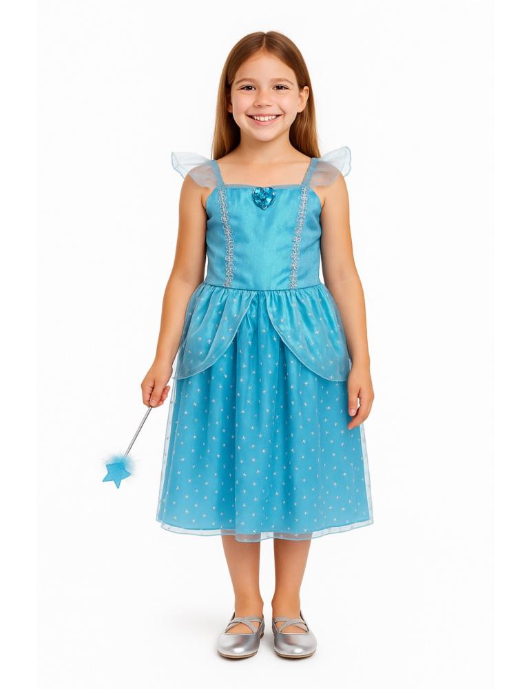 Bajkowa niebieska sukienka dla dziewczynki to idealny strój na bal, przedstawienie lub zabawę karnawałową.