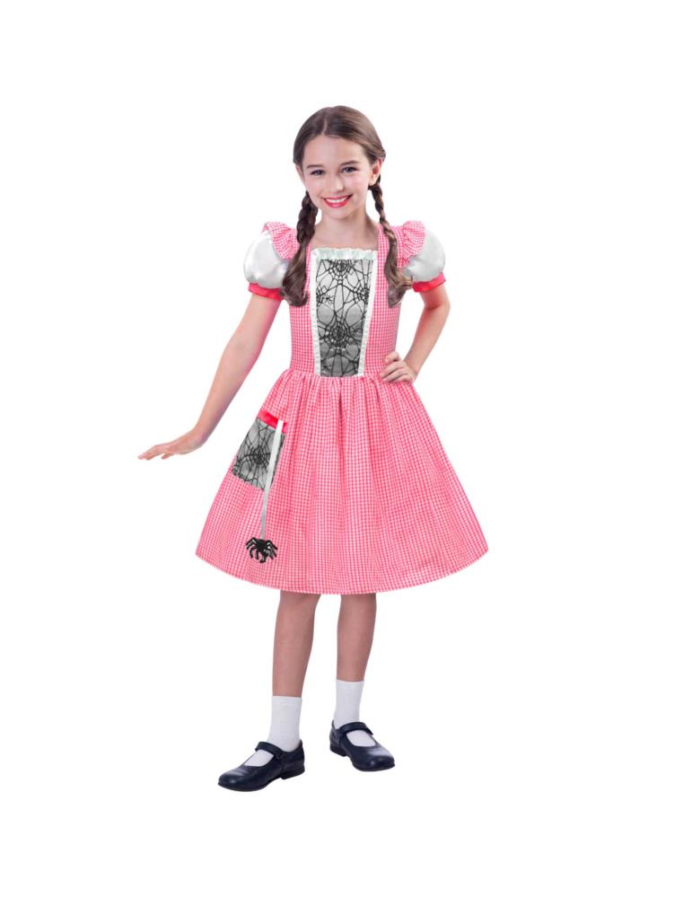 Przebranie składa się z sukienki w kratkę biało-czerwoną.Z przodu i na kieszonce ozdobiona tiulem z wizerunkiem pająków i pajęczyn, dodotkowo z kieszeni na wstążce przyczepiony pajączek.