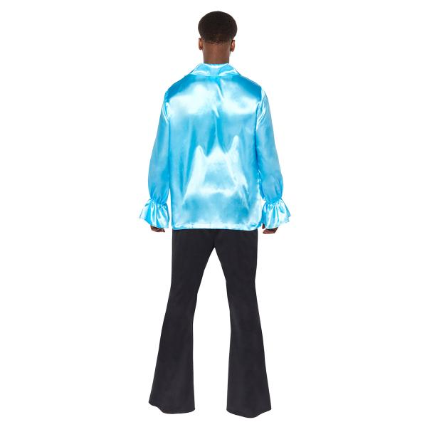 Stylowa satynowa koszula z falbanami w kolorze niebieskim XL to idealny element stroju inspirowanego modą lat 70. i 80.,