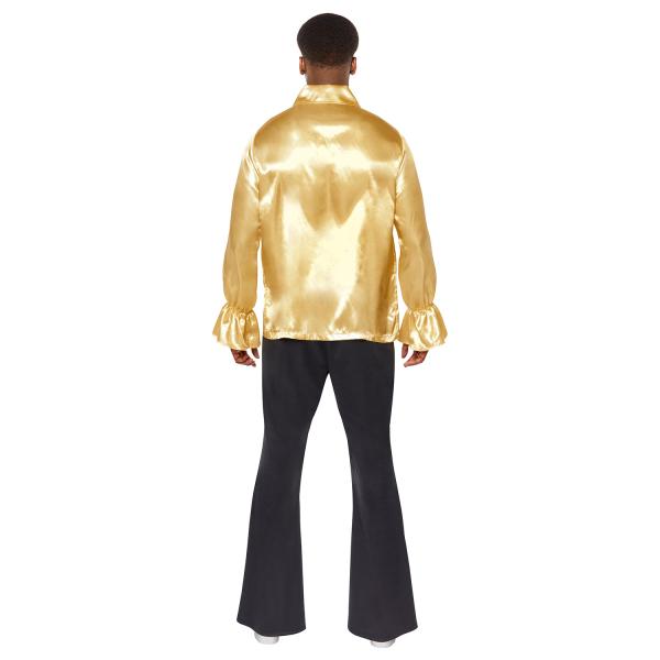 Stylowa satynowa koszula z falbanami w kolorze złotym XL to idealny element stroju inspirowanego modą lat 70. i 80.,