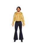 Stylowa satynowa koszula z falbanami w kolorze złotym L to idealny element stroju inspirowanego modą lat 70. i 80.,