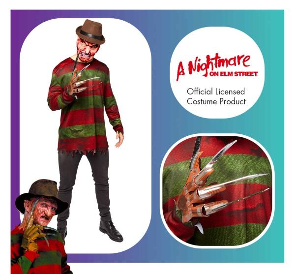 Kostium wiernie odtwarza charakterystyczny look Freddy’ego dzięki bluzie w czerwono-zielone paski, strasznej rękawicy z ostrzami