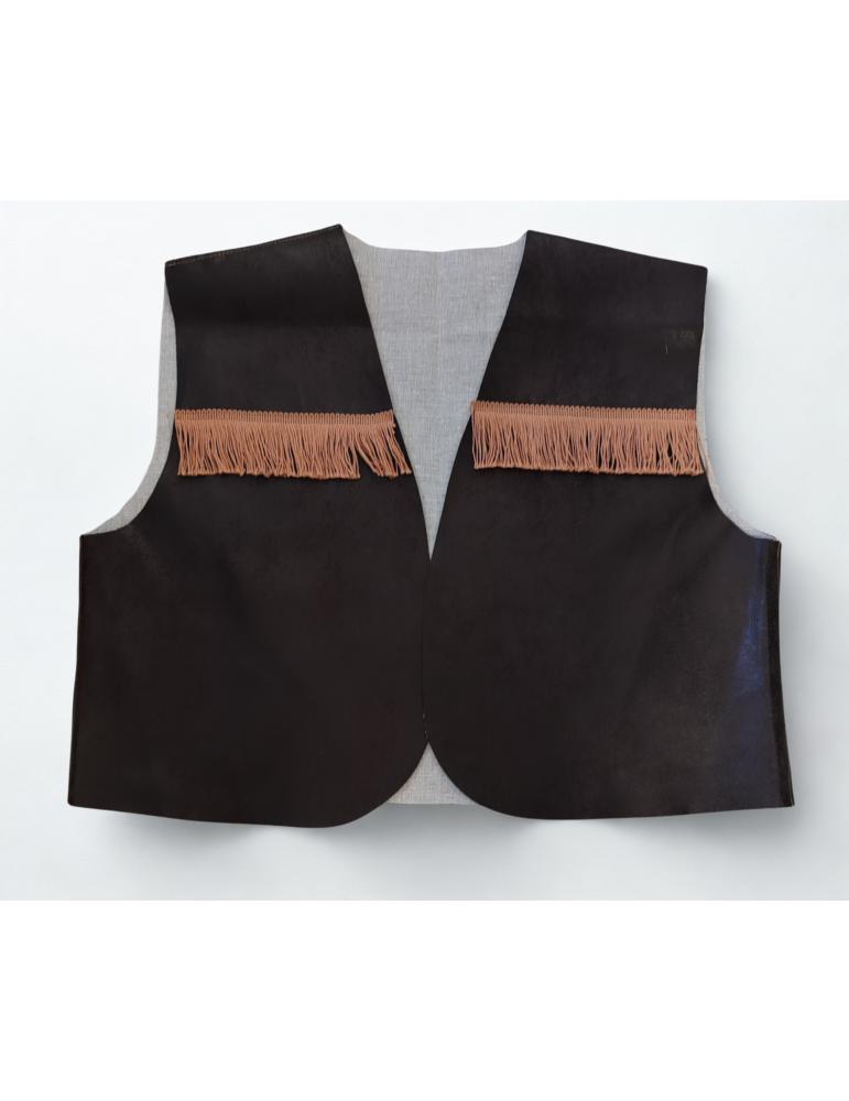 Przód kamizelki ozdobiony brązowymi frędzlami.