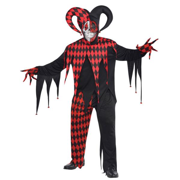 Czerń i czerwień oraz poszarpane detale tworzą klasyczny kostium jester w mrocznym wydaniu.