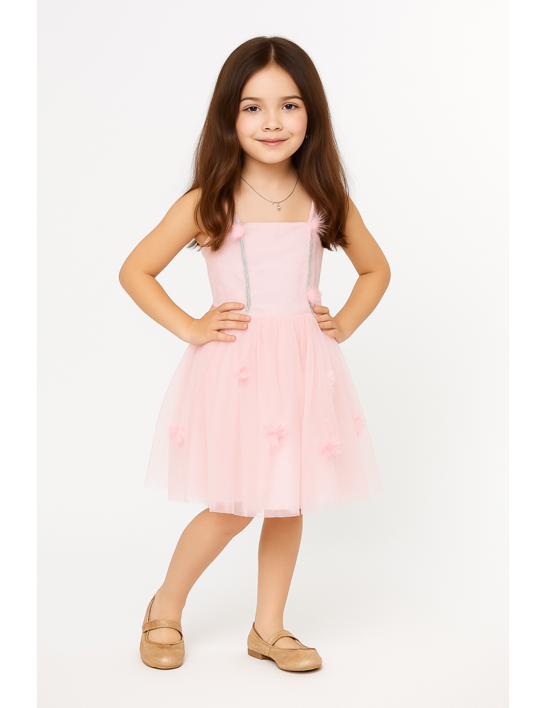 Urocza sukienka w pastelowym różu dla dziewczynki. Góra z delikatnymi ramiączkami i błyszczącymi detalami,
