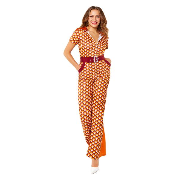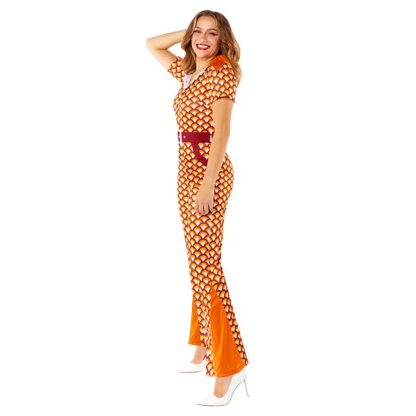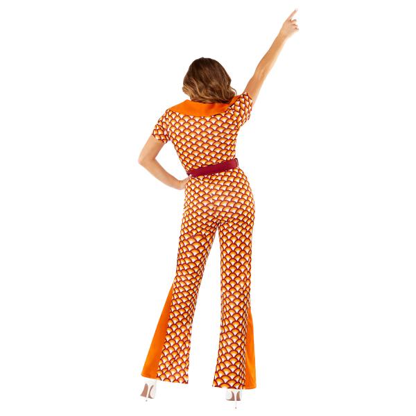 Kobiecy kombinezon w stylu lat 70. Idealny na imprezę tematyczną disco party, karnawał. Wygodny retro strój - kombinezon disco, lekki materiał i dopasowany krój podkreślają sylwetkę, a typowy dla stylu lat 70-tych krój z dzwonowatymi nogawkami i modnym cięciem dodaje retro-charakteru. Przebranie w stylu disco, to gotowa stylizacja dla kobiet, które chcą zabłysnąć stylizacją vintage lub taneczną – wystarczy dodać buty na obcasie lub akcesoria disco, by przyciągnąć spojrzenia i wejść w klimat lat 70.