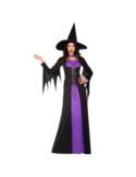 Kostium wyróżnia się ciemną sukienką z efektownymi detalami oraz naszyjnikiem, które nadają sylwetce dramatycznego charakteru.