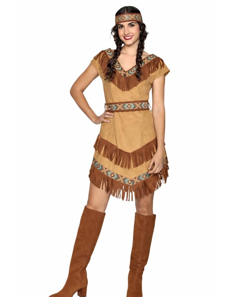 Strój składa się z krótkiej sukienki w odcieniach brązu i beżu, ozdobionej dekoracyjnymi frędzlami oraz etnicznymi wzorami, które podkreślają indiański charakter kostiumu. Do zestawu dołączona jest opaska na głowę, oraz pasek idealnie dopasowane stylistycznie do sukienki. Całość tworzy spójny, kobiecy i bardzo efektowny strój.