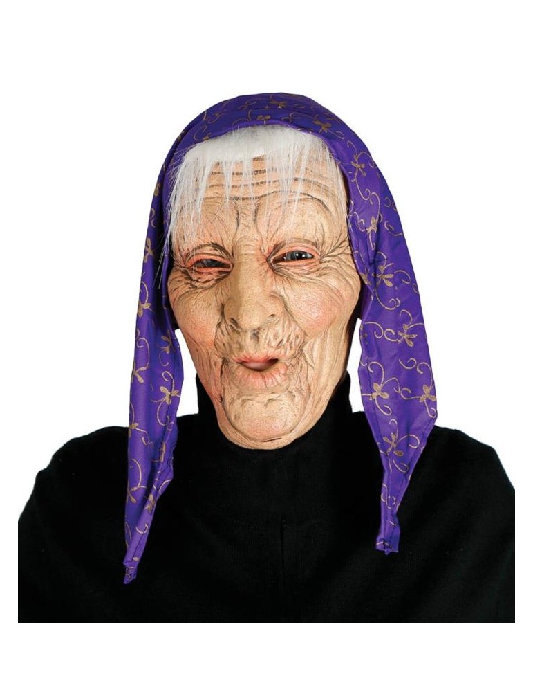 Lateksowa maska starej babci bądź czarownicy z włosami i chustą.