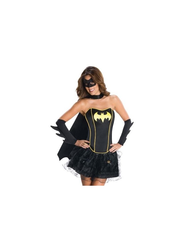 Gorset z logo batmana z żółtą lamówka, wiązany z tyłu.Krótka czarna spódnica z tiulowymi falbankami i kokardką z logo batmana.Do stroju dołączone nakładki na ręce z czarnymi ozdobami.W skład wchodzi jeszcze pelerynka zapinana z tyłu na rzep i piankowa maska na oczy.