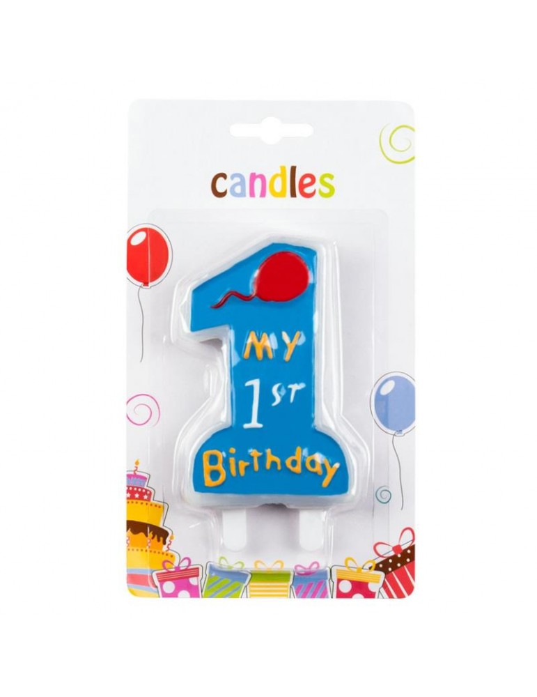 Niebieska świeczka cyferka z napisem My 1`st Birthday.