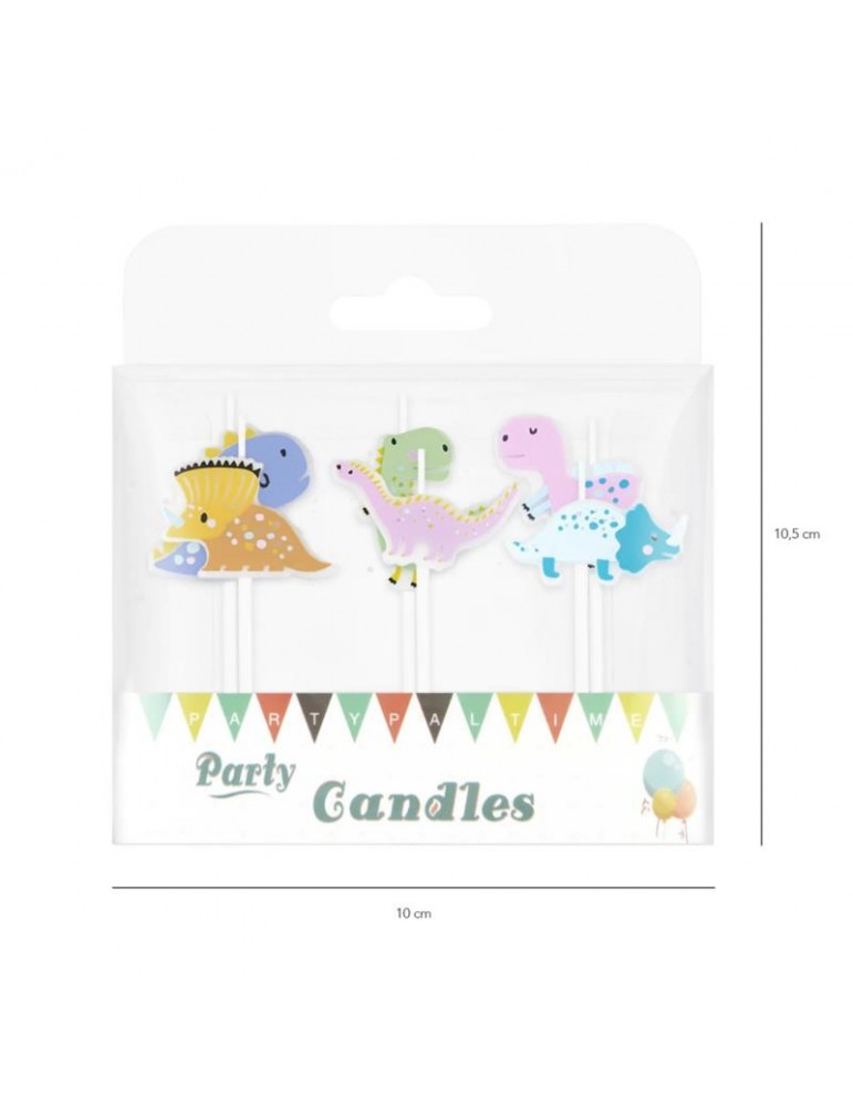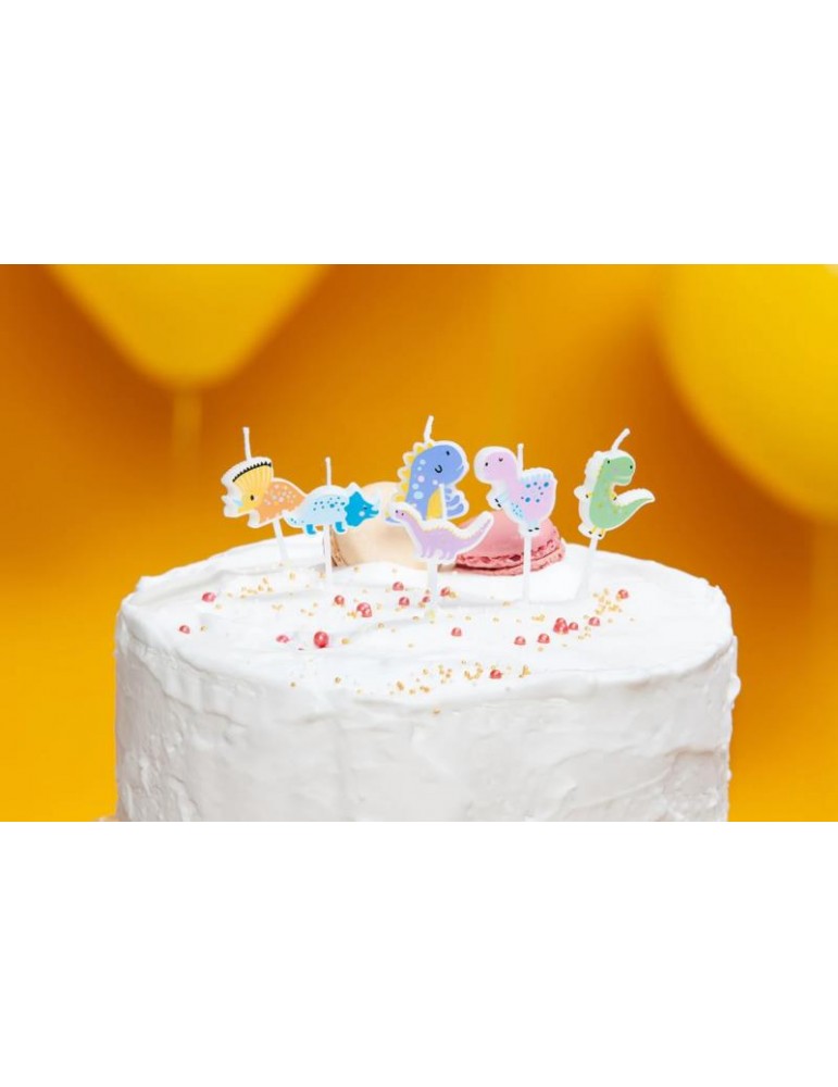 Przedstawiamy 6 świeczek na patyczku z wizerunkami różnych,kolorowych dinozaurów.