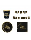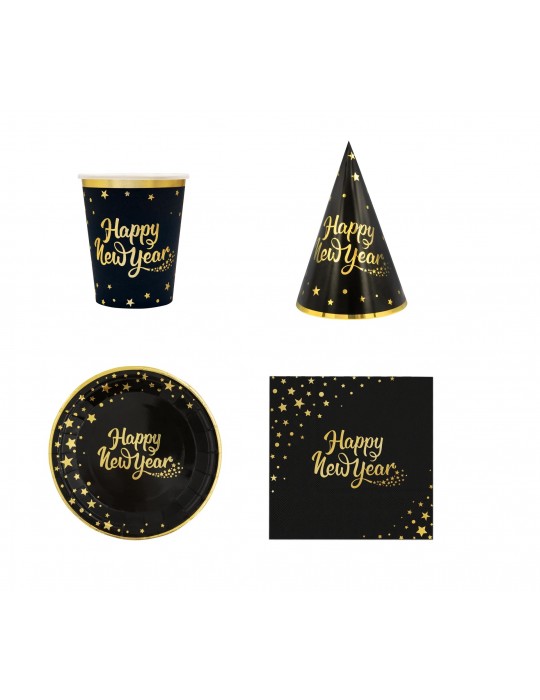 Zestaw Sylwestrowy Happy New Year Talerzyki Serwetki Kubeczki Czapeczki 28el MK545
