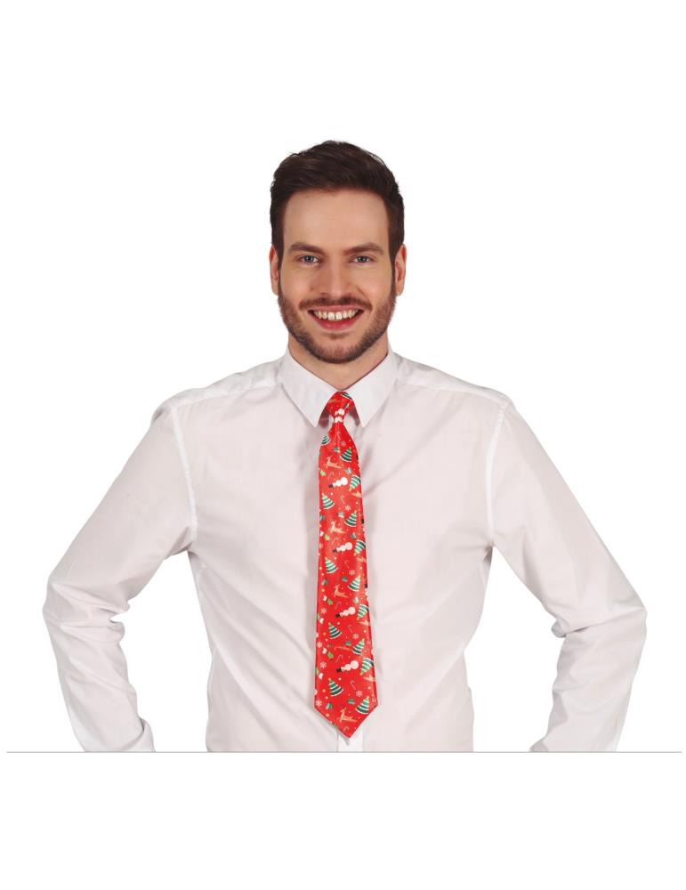 Krawat w kolorze czerwonym z nadrukiem świątecznym na którym jest Mikołaj,choinka,renifer.
