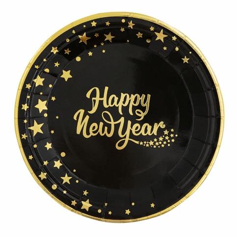 Talerzyki Happy New Year czarne 512661 6szt 15cm papierowe sylwester nowy rok