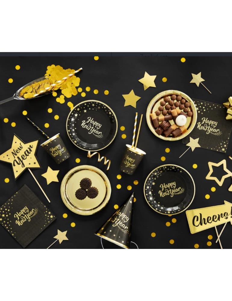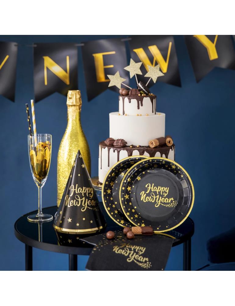 Papierowe czarne talerzyki w złote gwiazdki z napisem Happy New Year