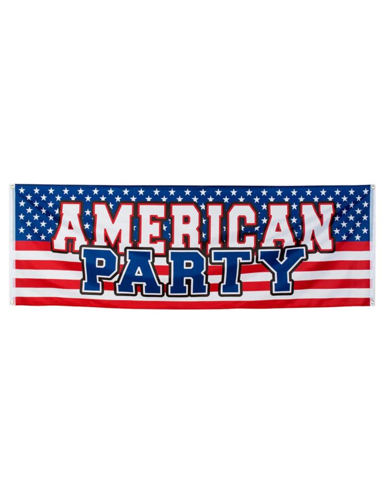 Materiałowa flaga USA z napisem "American Party" to doskonała dekoracja na imprezy w stylu amerykańskim. Wykonana z lekkiego, trwałego materiału, odporna na rozdarcia. Posiada metalowe oczka umożliwiające łatwe i szybkie zawieszenie w dowolnym miejscu. Idealna na urodziny, grille, święta narodowe i inne patriotyczne wydarzenia.