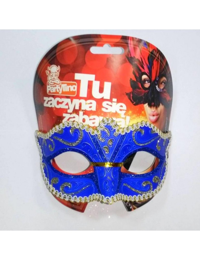 Maska w kolorze granatowym ze złotymi zdobieniami.