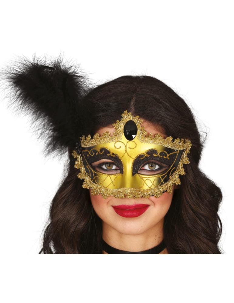 Maska Wenecka Czarno-złota z Piórem