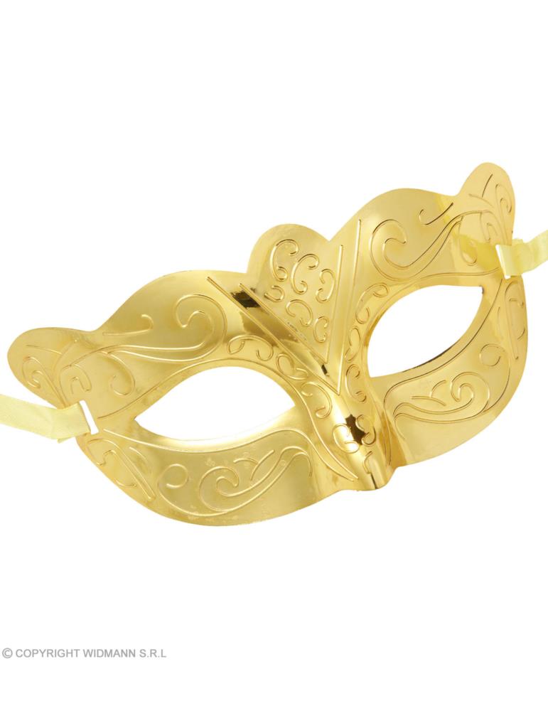 Plastikowa maska wenecka w kolorze złotym emanuje metalicznym blaskiem, dodając Twojemu wyglądowi elegancji i tajemniczości.