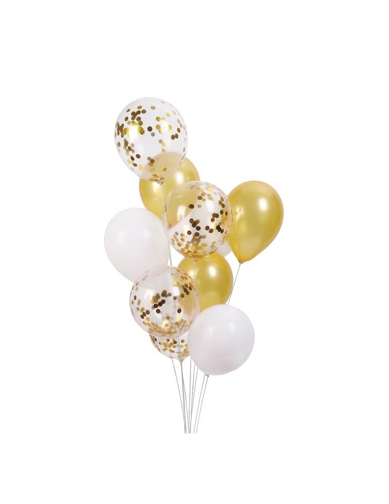 W zestawie znajdują się balony złote, transparentne z konfetti oraz białe.