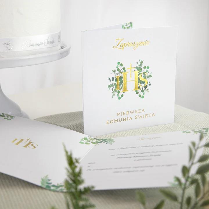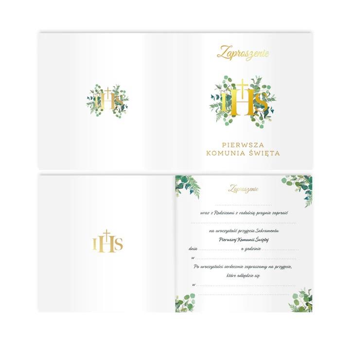 Głównym motywem na zaproszeniu jest złoty napis IHS z delikatnymi, zielonymi gałązkami eukaliptusa w tle.