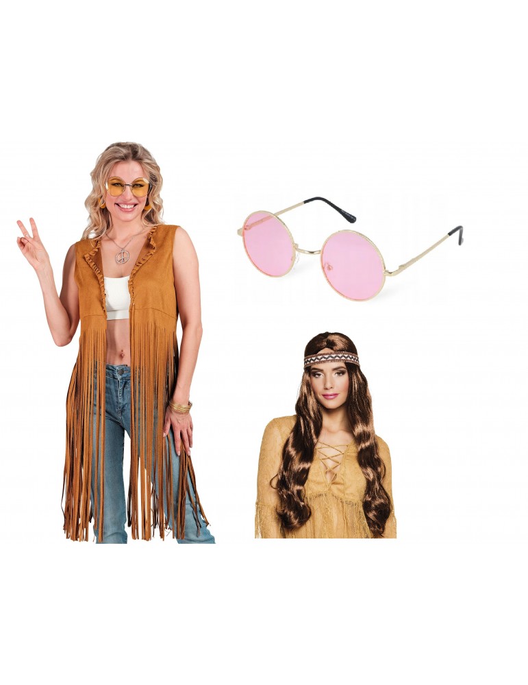 Zestaw Strój Kamizelka Hipiski Peruka Brązowa Okulary Lenonki 3el MK597