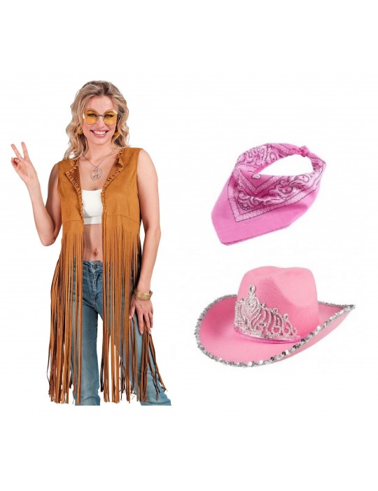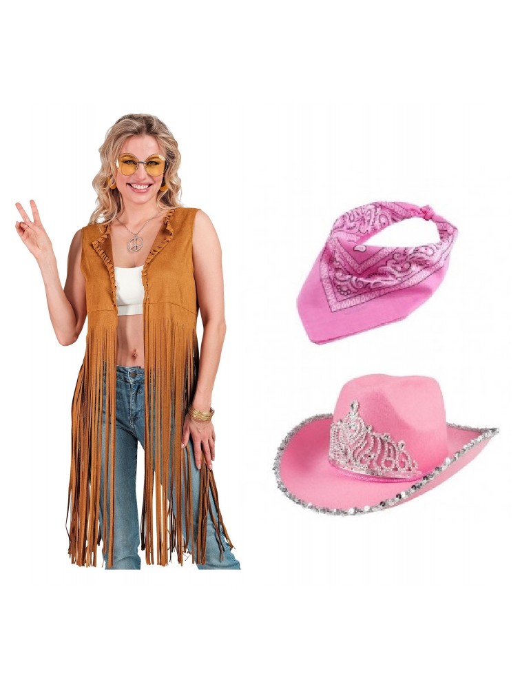 Zestaw Strój Kamizelka Kowbojki Bandanka Kapelusz z Cekinami Różowy 3el MK606