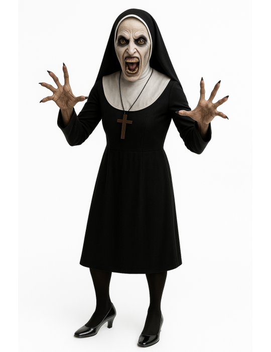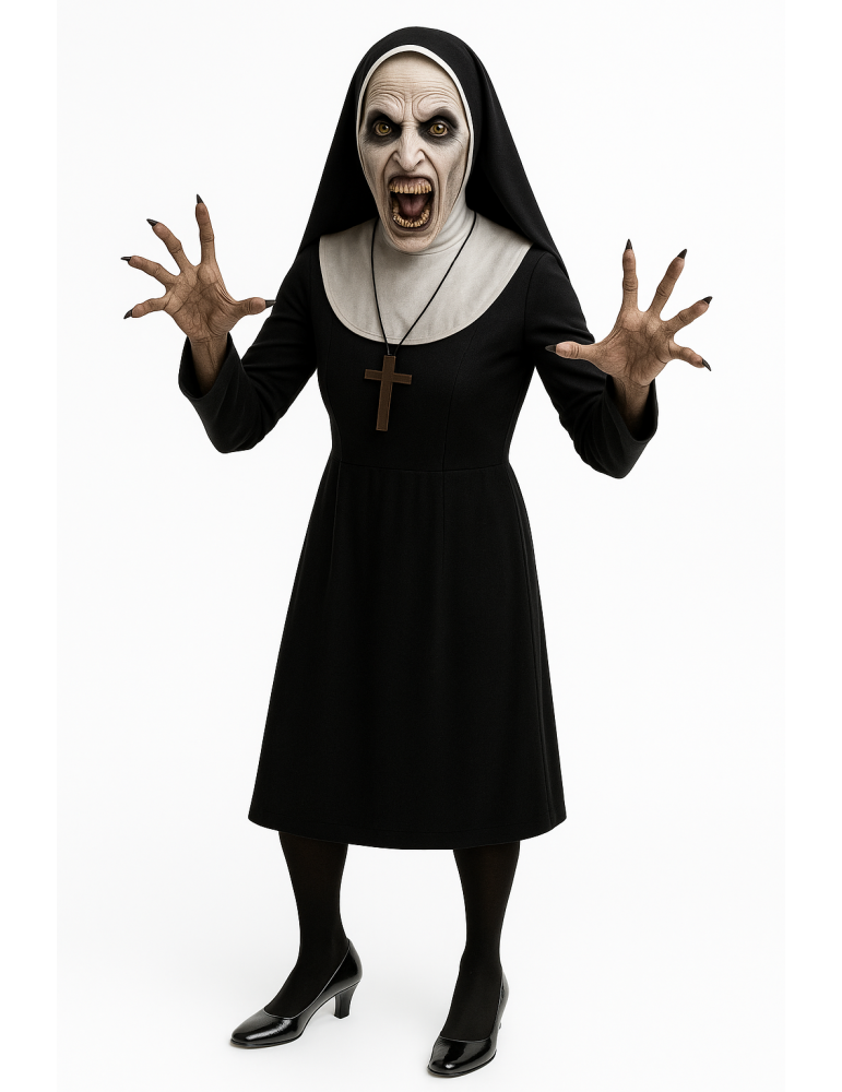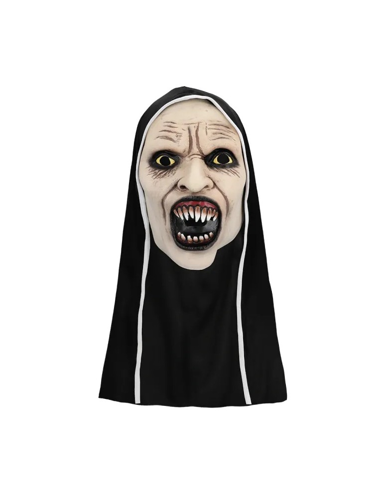 Przerażająca maska lateksowa przedstawiająca demoniczną zakonnicę z ostrymi zębami i upiornym spojrzeniem.