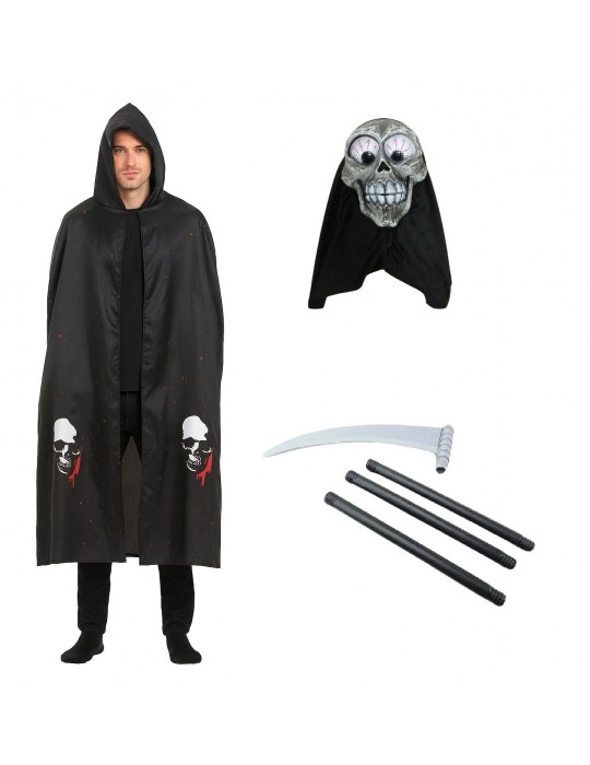 Czarną pelerynę z kapturem z motywem czaszek i krwi.
