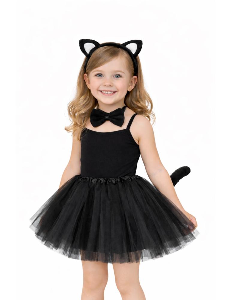 Strój kotka dla dziewczynki ze spódniczką, to ładny, prosty i efektowny strój pasujący każdej dziewczynce
