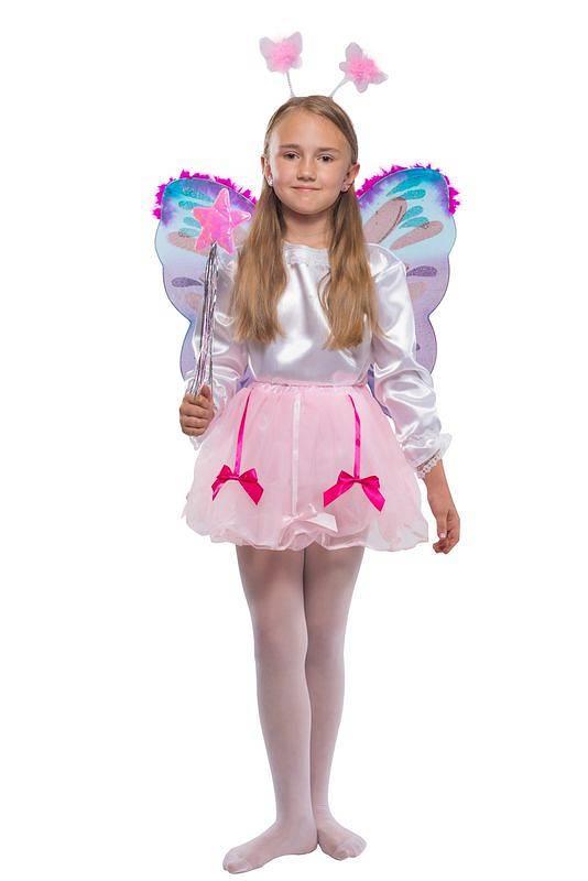 W skład kompletu wchodzi tiulowa tutu spódniczka w różowym kolorze, ozdobiona wiszącymi kokardkami. Skrzydła motyla z cienkiego materiału zakładane na gumkę w kolorze fioletowo-niebieskim,ozdobione różowym puszkiem dodają uroku. Opaska z uroczymi czułkami w kształcie motyli z różowym puszkiem doskonale uzupełnia całość, a różdżka z gwiazdką pozwala na tworzenie bajkowych czarów. Strój jest wygodny i łatwy do noszenia, idealny na bale, urodziny czy kreatywne zabawy. To kolorowy zestaw pełen radości i dziecięcej magii!