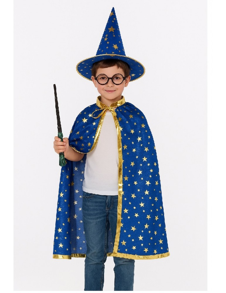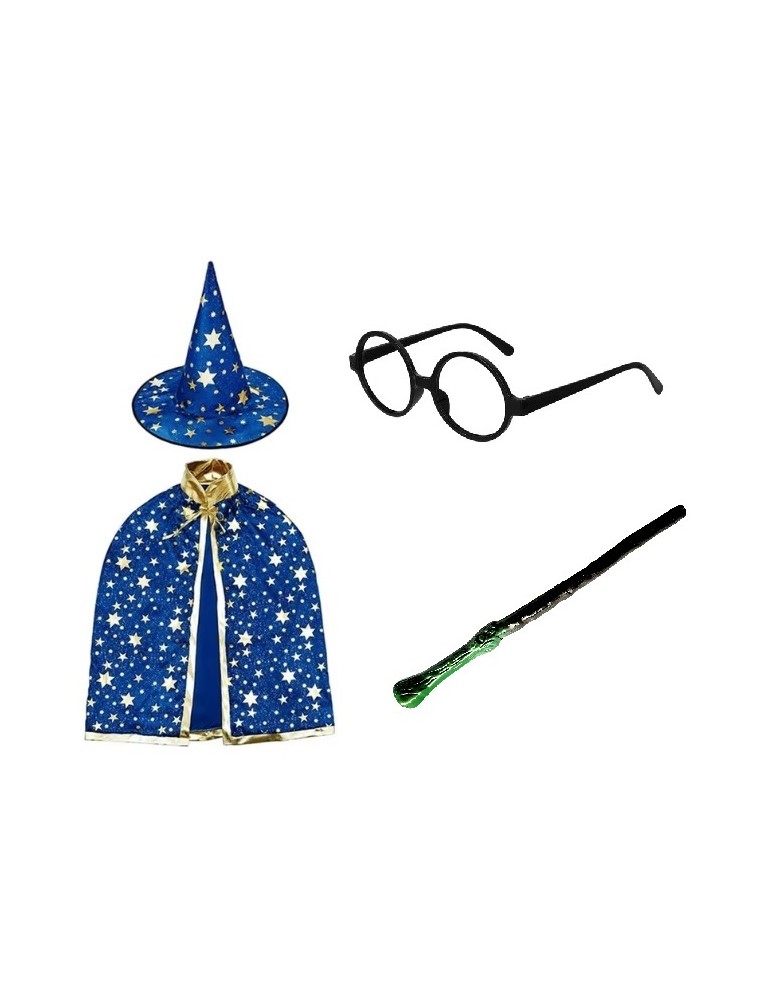 Zestaw Strój Czarodziej Magik Peleryna Kapelusz Różdżka Okulary Niebieski 4el MK910