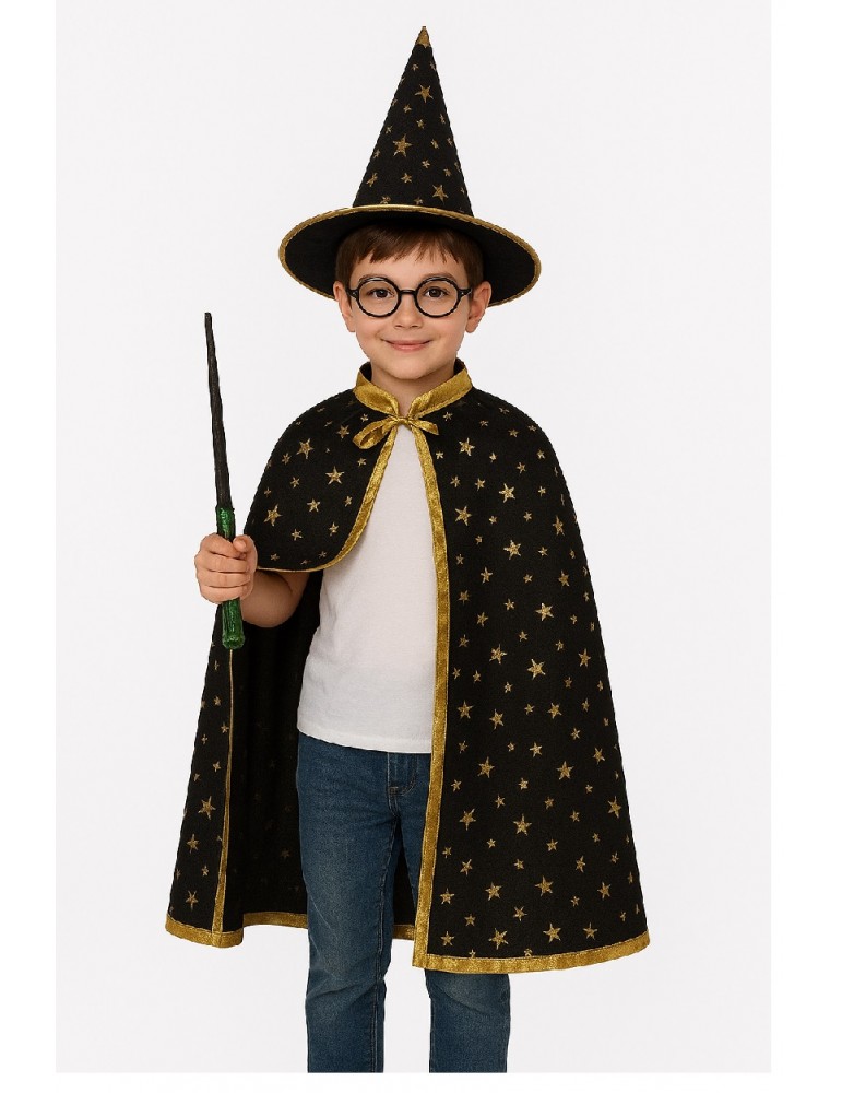Magiczny zestaw czarownicy, czarodzieja lub magika w klasycznym stylu. Składa się z czarnej peleryny ze złotym kołnierzem oraz szpiczastego kapelusza, oba ozdobione pięknymi, złotymi gwiazdkami. Peleryna wiązana pod szyją zapewnia wygodę i swobodę ruchów, a kapelusz dodaje czarującego wyglądu. Idealny wybór na Halloween, karnawał lub tematyczne imprezy, który pozwoli wyróżnić się w tłumie i nada Twojemu kostiumowi odrobinę magicznego blasku.