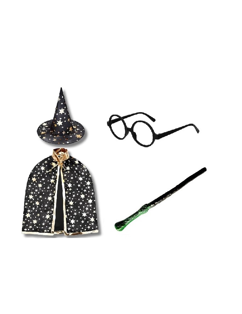 Zestaw Strój Czarodziej Magik Peleryna Kapelusz Różdżka Okulary Czarny 4el MK911