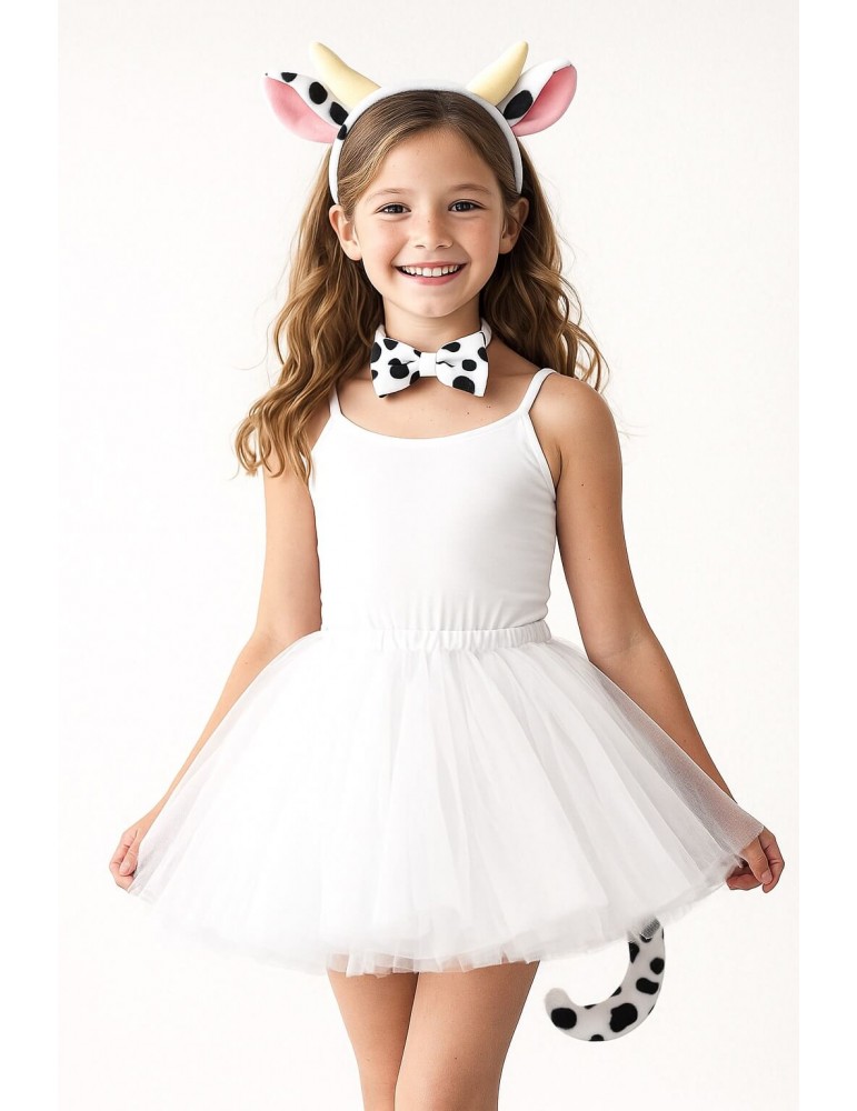Zestaw Strój Krowa Krówka TuTu Białe 40cm Opaska Ogon Mucha 4el MK921