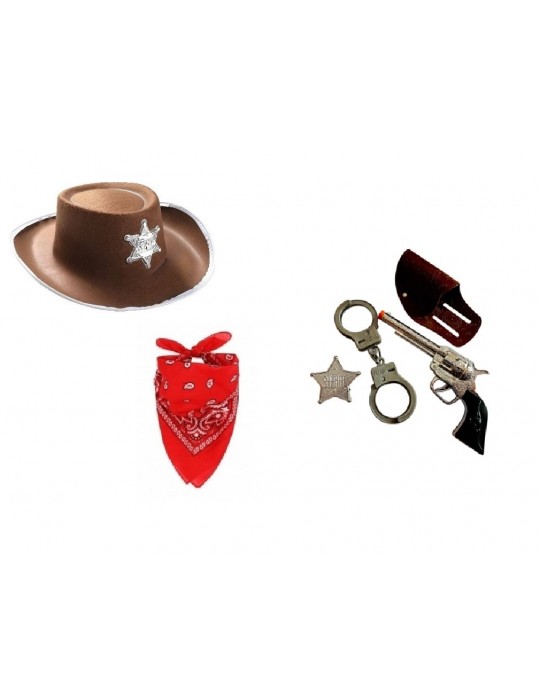 Zestaw Kowbojski Kapelusz Brązowy z Bandanką Pistolet z Kaburą 6el MK818