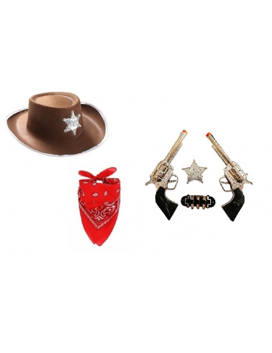 Zestaw Kowbojski Kapelusz Brązowy z Bandanką Pistolety z Kaburą 9el MK819