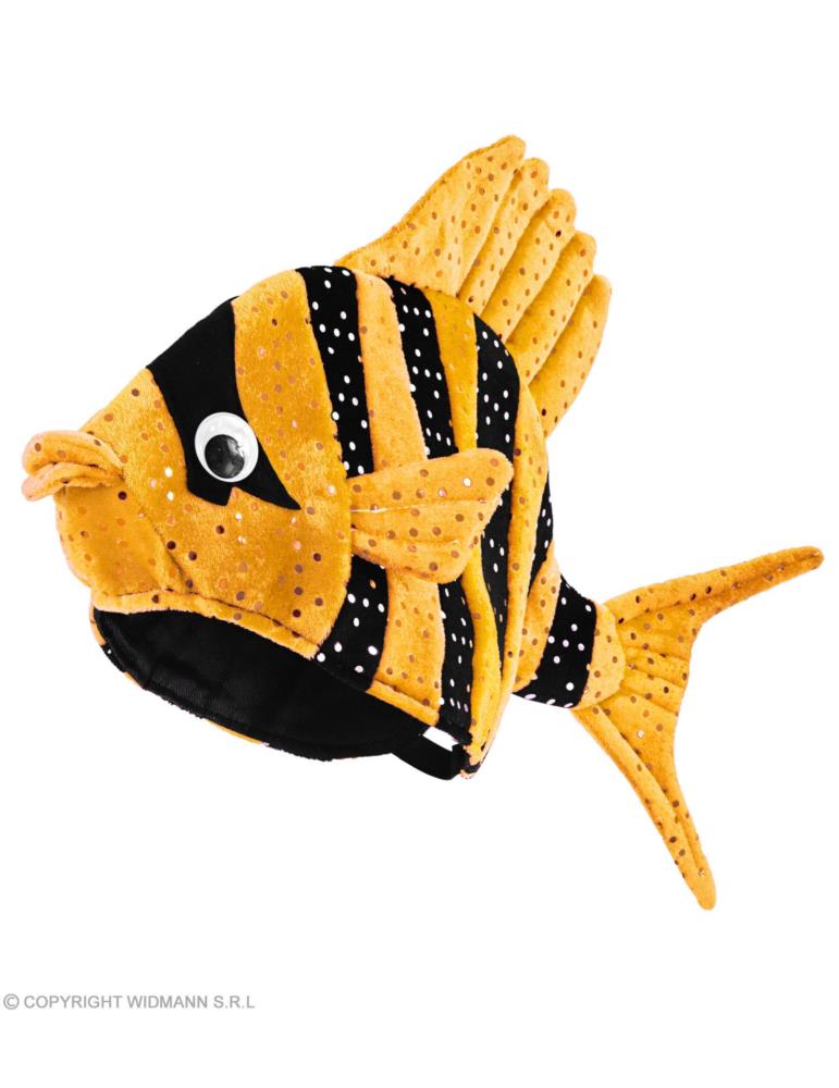 Pomarańczowa czapka z czarnymi paskami, które przypominają troikalną rybkę!