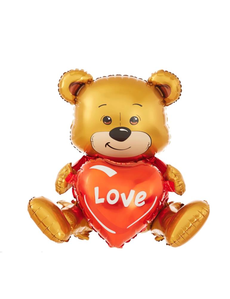 Balon foliowy przedstawiający sympatycznego misia, z sercem z napisem "Love" (Miłość).